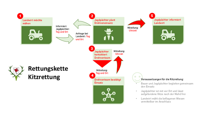 4. Ein/Der Jagdpächter ist beim Einsatz unbedingt mit vor Ort und erklärt sich bereit festgesetzte Kitze nach der Mahd wieder freizulassen.