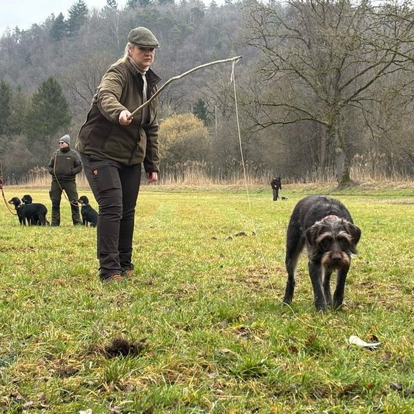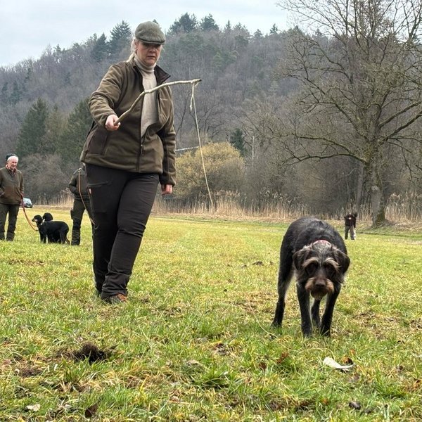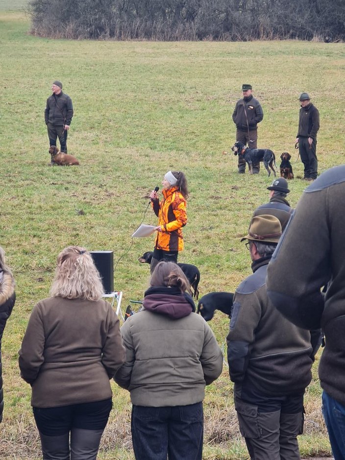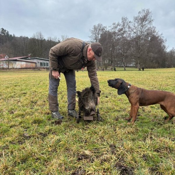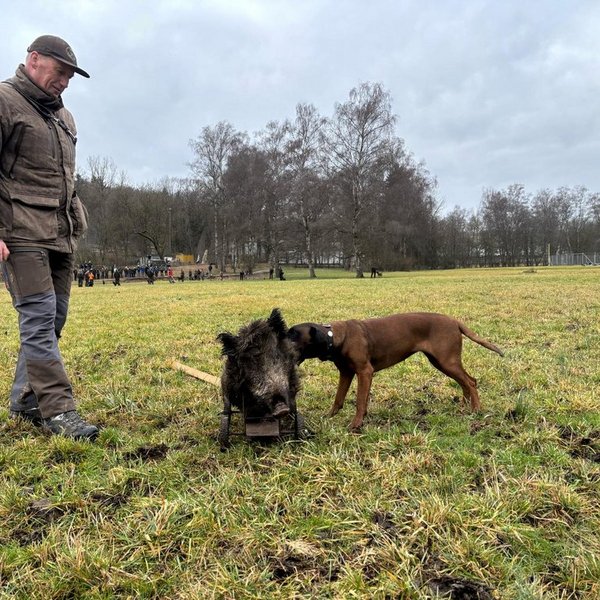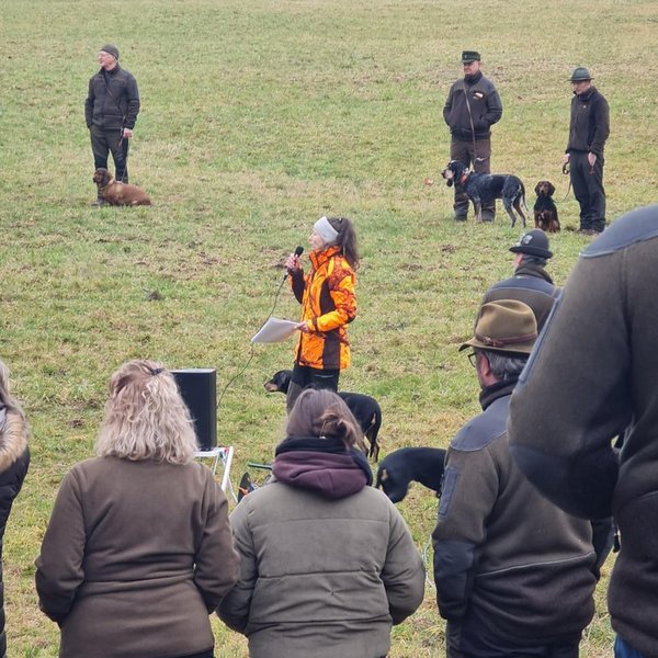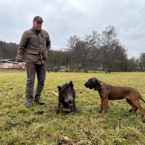Von Stöberhunden über Erd- und Vorstehhunde bis hin zu hochspezialisierten Schweißhunden waren insgesamt 19 Rassen vertreten. Im Rahmen einer Pfostenschau wurden die Hunde und ihre besonderen Merkmale vorgestellt. Darüber hinaus boten praxisnahe Vorführungen eindrucksvolle Einblicke in die tägliche Arbeit der Jagdhunde: So demonstrierte Thea Berger mit ihrer Deutsch Drahthaar-Hündin „Mäusel“ eine überzeugende Vorstehübung sowie einen sauber ausgeführten Apport und unterstrich damit die Vielseitigkeit eines Vollgebrauchshundes. Tobias Binmöller zeigte die konzentrierte und präzise Schweißarbeit seines Bayerischer Gebirgsschweißhund „Lenus“, der die Wundfährte sicher ausarbeitete und die Wagensau am Ende der Fährte zuverlässig verbellte.