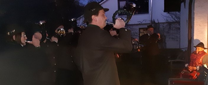 Nach einem geselligen Abend, bei dem viel gesungen wurde, verabschiedete sich das Bläsercorps, in dem es nochmals die Hörner in die Abendstimmung schallen ließ.