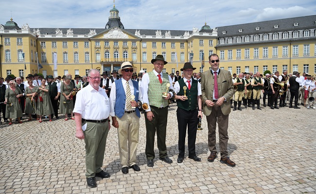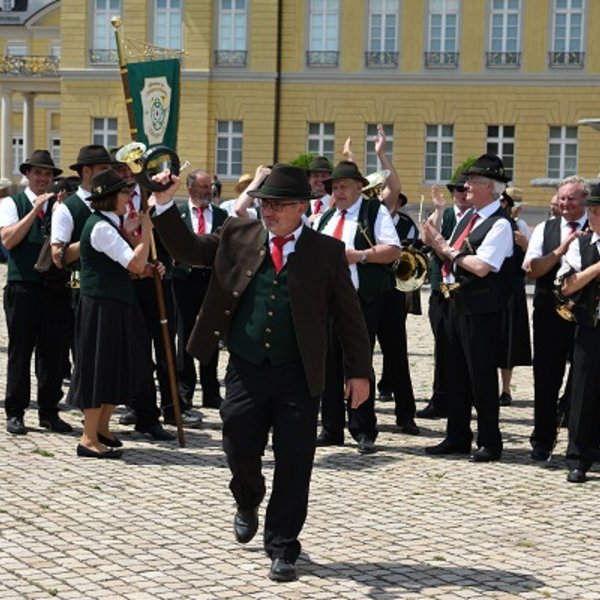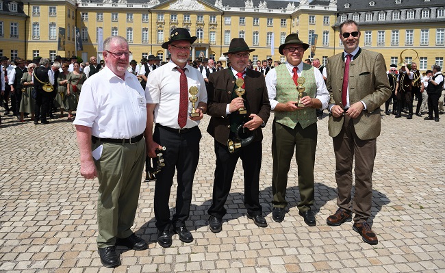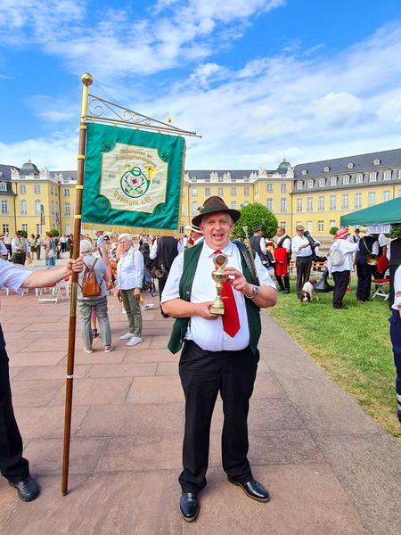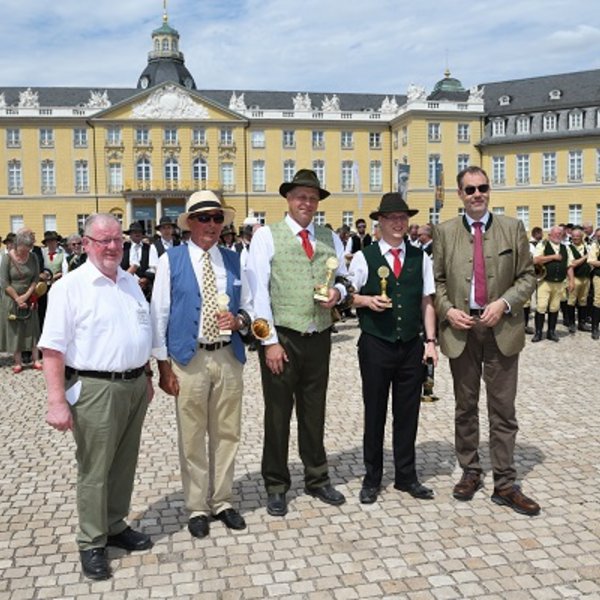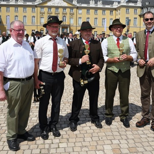 Am vergangenen Sonntag, 26.06.22 war es soweit. Nach über 40 Jahren holt sich unser Bläsercorps verdientermaßen den ersten Platz und wird Landessieger von Baden-Württemberg. Unter der bewährten und engagierten Leitung seines musikalischen Leiters Hansjörg Maier aus Dußlingen spielte sich das Corps nicht nur in die Herzen der zahlreichen Zuhörer sondern überzeugte mit ihrer Leistung auch die Fachjury. Bei "Kaiserwetter" und vor der beeindruckenden Kulisse des Karlsruher Schlosses hieß es am Ende unter lautem Jubel: Platz 1 für die Bläser der Kreisjägervereinigung Tübingen! Für die Musiker ist der Gewinn auf Landesebene ein Megaerfolg, auf den sie konsequent hingearbeitet und geprobt haben. Überwältigt von dem Ergebnis wollte die Freude nicht enden - und ein paar Tränen flossen ganz sicher auch.