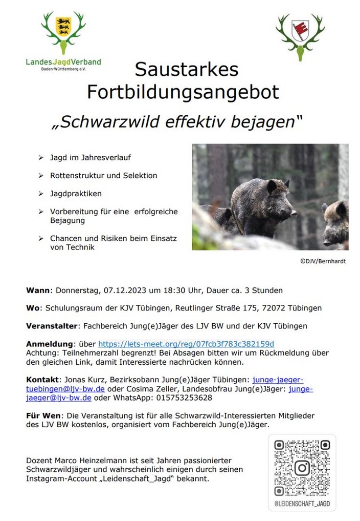 Zahlreiche unserer Mitglieder haben sich an uns und die Hegeringleiter gewendet, da sie aus verschiedenen Quellen von einer Fortbildung der KJV Tübingen zur Bejagung von Schwarzwild gehört hatten, die angeblich nicht angekündigt worden sei.