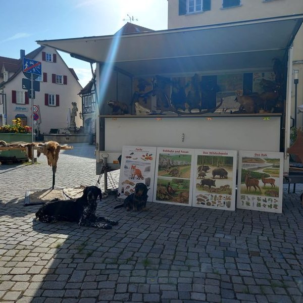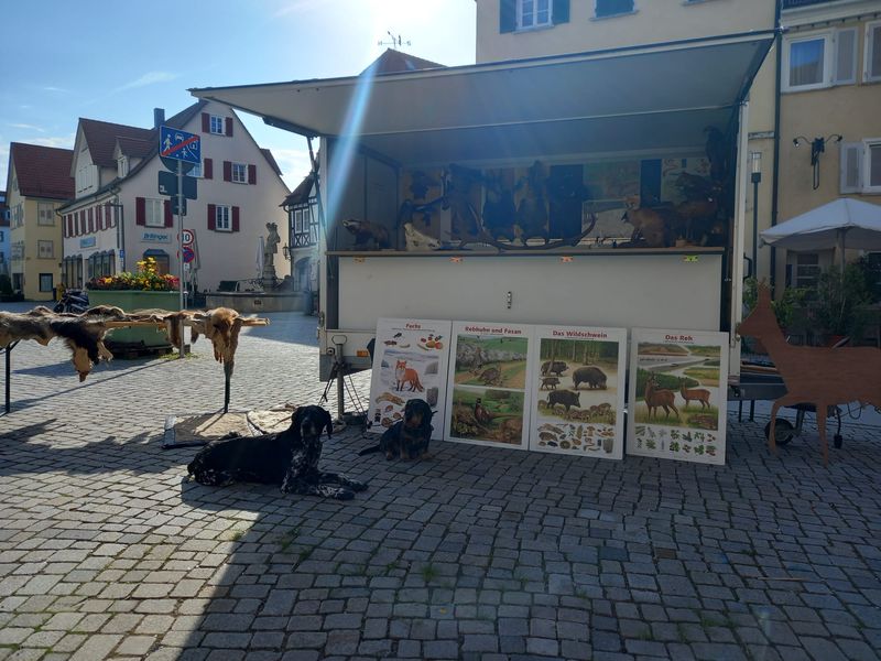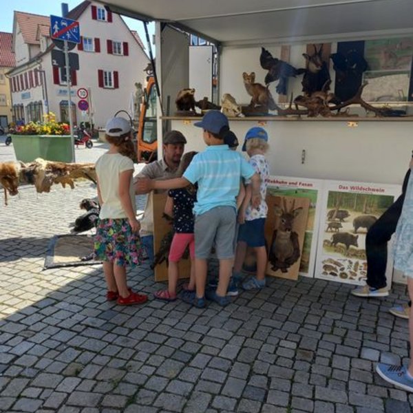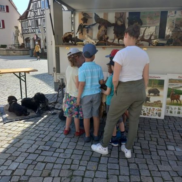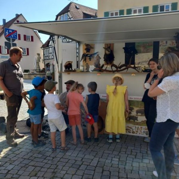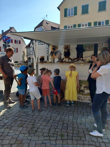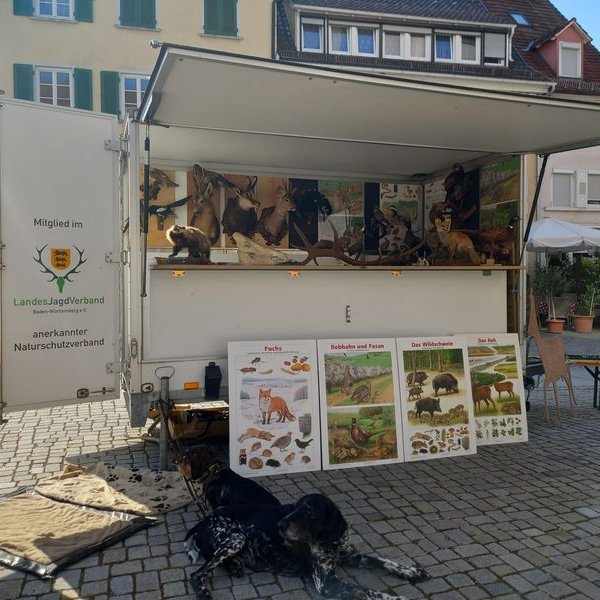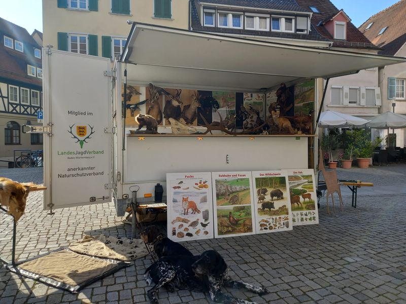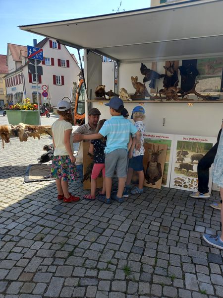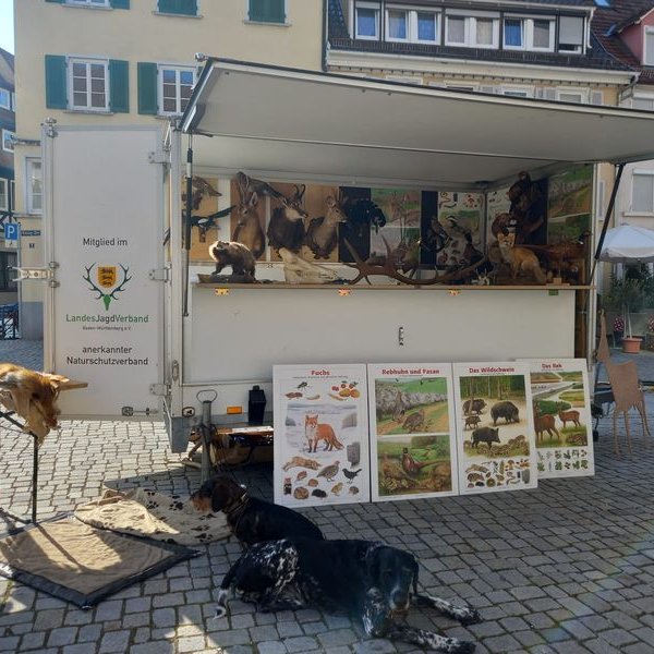 Am 20. Mai 2022 hat der „Lernort Natur"-Anhänger unserer Kreisjägervereinigung (KJV) Tübingen in Rottenburg Station gemacht. Zusammen mit der Forsthochschule und der Stadtbibliothek empfingen wir zwei Kindergartengruppen im Alter von 4 – 6 Jahren als unsere Gäste. Die Kinder lauschten an diesem Vormittag zunächst in der Bibliothek einer spannenden Geschichte über ein Eichhörnchen, das Hilfe von Waldtieren bekam. Danach ging es für die Kids vor die Bibliothek, wo für die Kleinen zwei Stationen aufgebaut waren. Zum Einen den Anhänger der KJV, wo wir über Jäger und Waldbewohner informierten und zum Anderen die Station der Forsthochschule, die etwas über Bäume zeigte und erzählte. Voller Begeisterung pflanzten die Kinder zusammen mit den Anwesenden der Forsthochschule kleine Ulmen, die sie im Anschluss mit nach Hause nehmen durften. Am Ende des Vormittags bekam der Kindergarten noch Malbücher für seine Gruppen als Geschenk überreicht, die dankend und mit Freude angenommen wurden. Bei der Verabschiedung waren sich alle kleinen und großen Menschen einig: „Was für ein super schöner Morgen“ – und was für ein Spaß für alle.