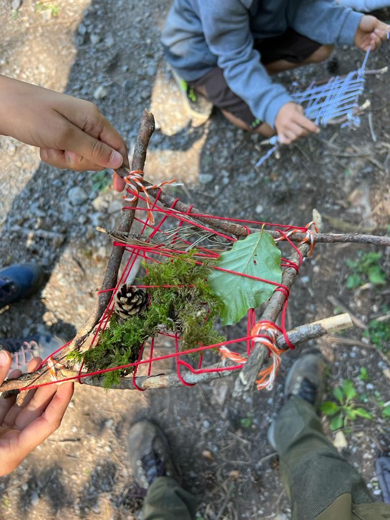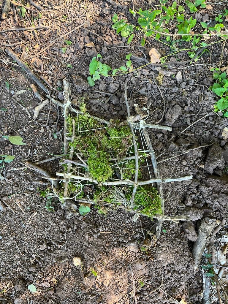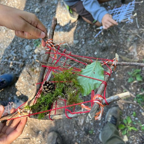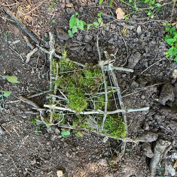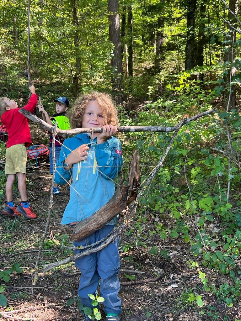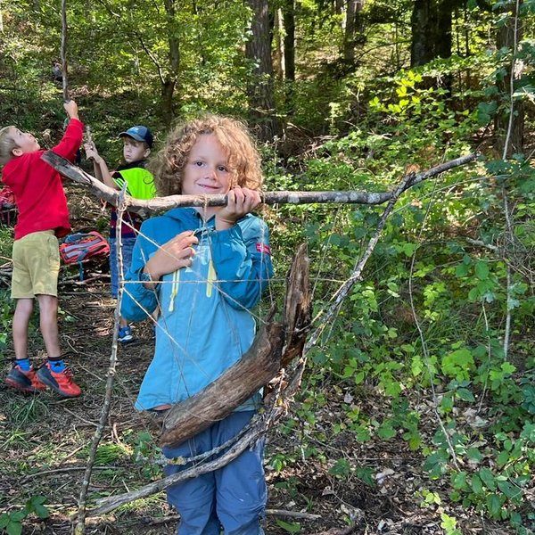 Kaum im Wald angekommen, lernen die Kinder mit Ästen, Stöcken, Zapfen und Moos, wie Waldsofas gebaut werden und schaffen Kunst aus Natur in der Natur.