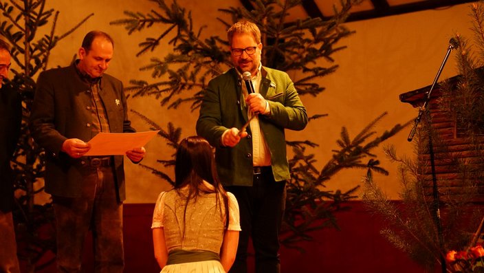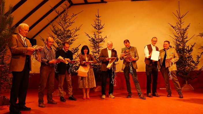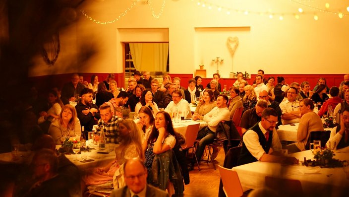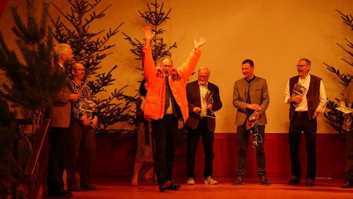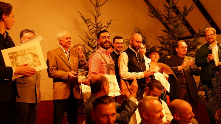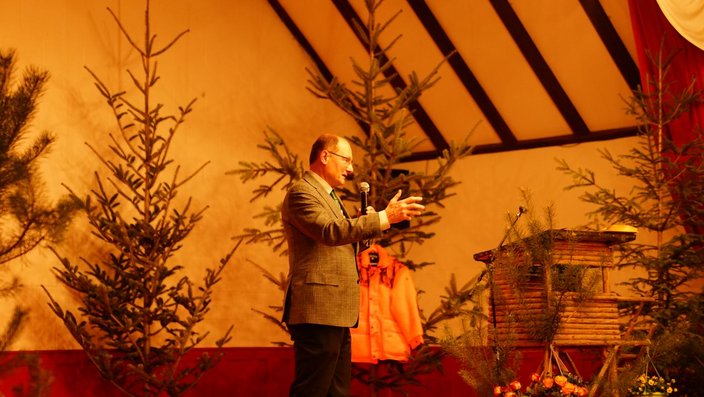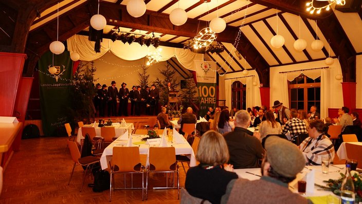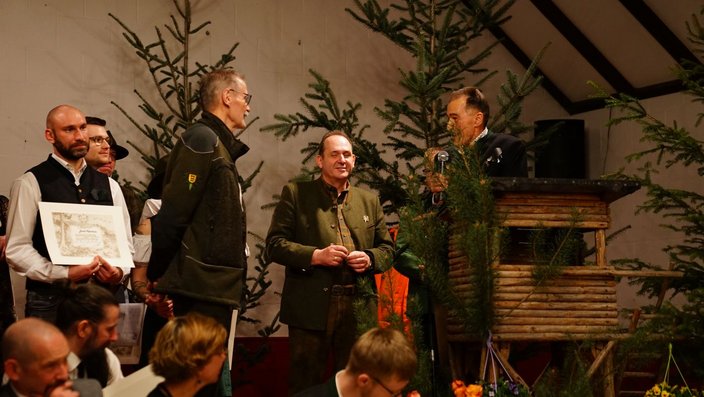 Im Schlosssaal zu Bühl kommen die Jungjäger mit Ihren Familien, Freunden und Gästen zur Galaveranstaltung zusammen. Begrüßt werden sie mit Jagdhornsignalen des Bläsercorps Tübingen und Festansprachen vom Kreisjägermeister Markus Küper und dem Jagdschulleiter Ulrich Maurer. Beide betonen die sehr guten Leistungen, die die Absolventen an den Prüfungstagen gezeigt haben. Jungjäger-Obmann Jonas Kurz und die anwesenden Hegeringleiter sind zudem bereit, die neuen Jäger direkt unter ihre Fittiche zu nehmen. Ein Wermutstropfen ist die Verabschiedung von Schießlehrer Hans-Peter Sämann aus dem Ausbildungs-Team der KJV Tübingen, der sich aus der vordersten Reihe zurückzieht, aber bei Not am Mann weiter zur Verfügung steht. Er wird mit der neuen Ehrennadel der KJV Tübingen geehrt.
