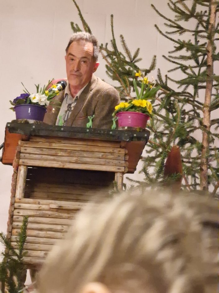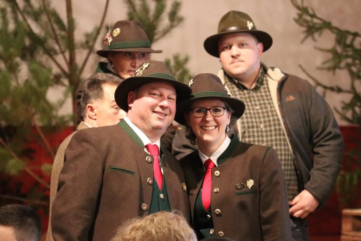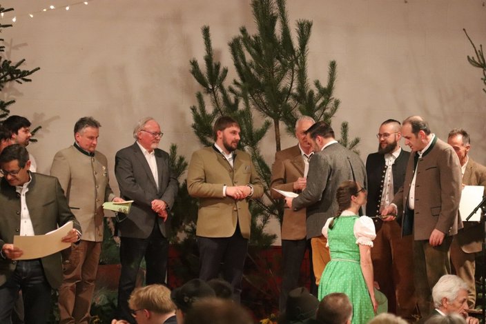 Tobias Walker nimmt mit dem Jägerschlag die Jungjäger in die Verantwortung für ihr jagdliches Handeln. Moderator Axel Ehrmann führt in seiner launigen und kurzweiligen Moderation durch den Abend. Er betont die Bedeutung des Jägerschlags und die Verantwortung für die Natur, die mit der Jagd verbunden ist.
