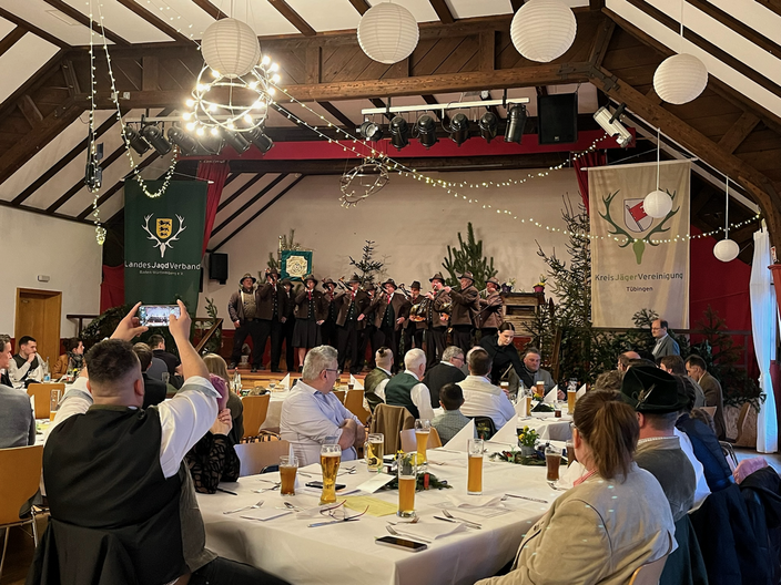 Im Schlosssaal zu Bühl kommen die Jungjäger mit Ihren Familien, Freunden und Gästen zur Gala zusammen. Begrüßt werden sie mit Jagdhornsignalen des Bläsercorps Tübingen sowie den Ansprachen von Tobias Walker, stellvertretender Kreisjägermeister und Ulrich Maurer, dem langjährigen Jagdschulleiter. Beide betonen die sehr guten Leistungen, die die Absolventen an den Prüfungstagen gezeigt haben.
