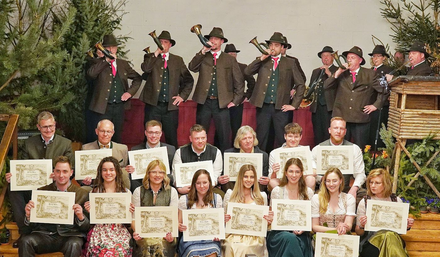 In dem festlich geschmückten Schlosssaal zu Bühl begrüßten Kreisjägermeister Markus Küper und der geschäftsführende Vorstand der Kreisjägervereinigung Tübingen die neuen Jungjägerinnen und Jungjäger der Kreisjägervereinigung Tübingen mit ihren zahlreichen Angehörigen und Freund*innen. Das Bläsercorps der Kreisjägervereinigung liess es sich auch dieses Jahr nicht nehmen, den Abend zu einem besonderen Ereignis für die Jungjägerinnen und Jungjäger zu machen und umrahmte die Feier mit stimmungsvollen Musikstücken.